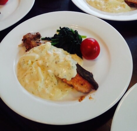 メインのサーモンステーキは、サーモンに自家製タルタルソースをたっぷりかけて。