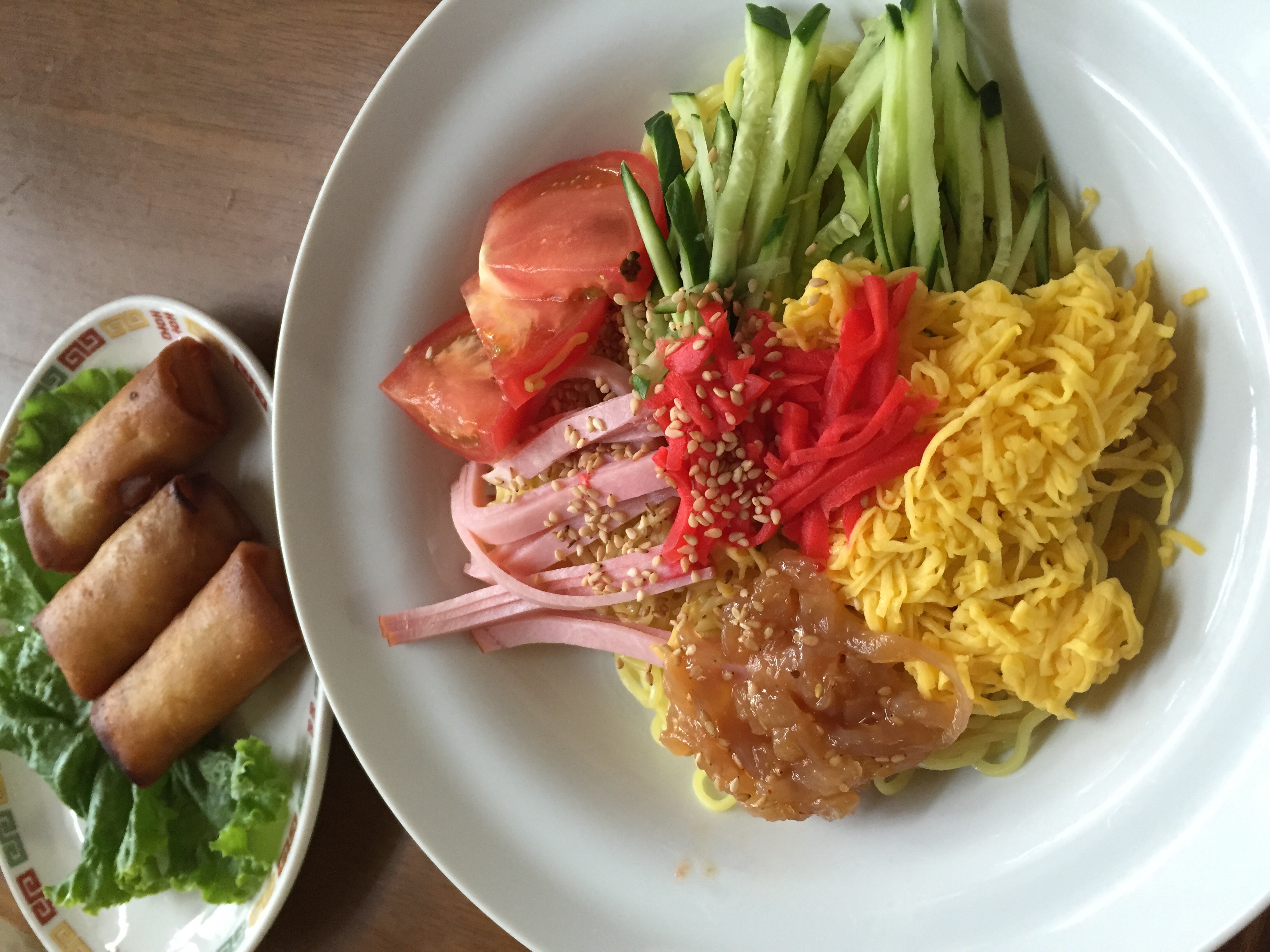 さて本日の晩ごはんは、冷やし中華と春巻きです。